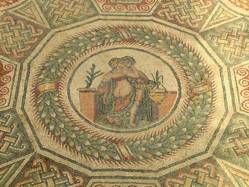 Le Péristyle majeur dévoile des mosaïques représentant motifs géométriques et scènes inspirées de la mythologie. Construit autour d’une cour intérieure agrémentée d’une fontaine, il reflète l’ingénierie romaine qui valorisait la circulation de la lumière. Ce lieu date également du début du IVe siècle et témoigne de la volonté d’impressionner les visiteurs.