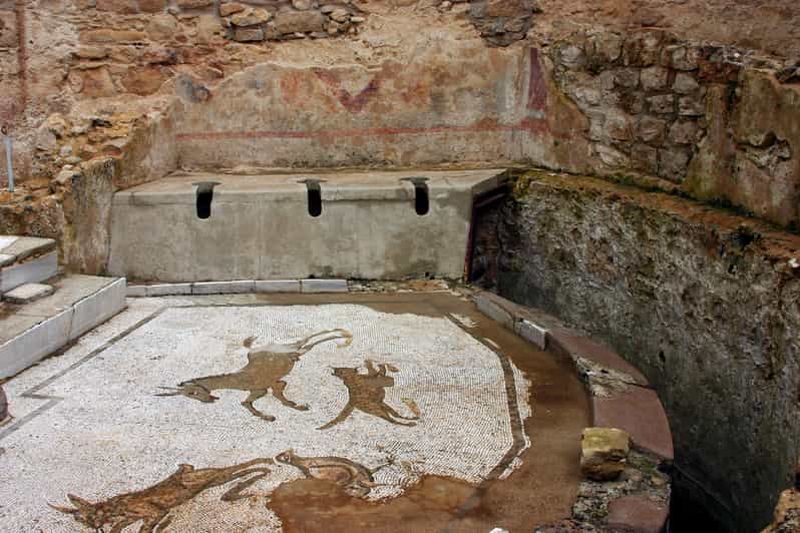 Les thermes proposent différentes salles de bains richement décorées. Construites au début du IVe siècle, elles comportent caldarium, tepidarium et frigidarium reliés par un ingénieux système de chauffage souterrain. Chaque salle présente des mosaïques évoquant des thèmes aquatiques ou mythologiques, soulignant l’importance de l’hygiène et du bien-être dans la culture romaine.