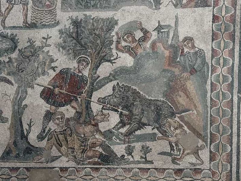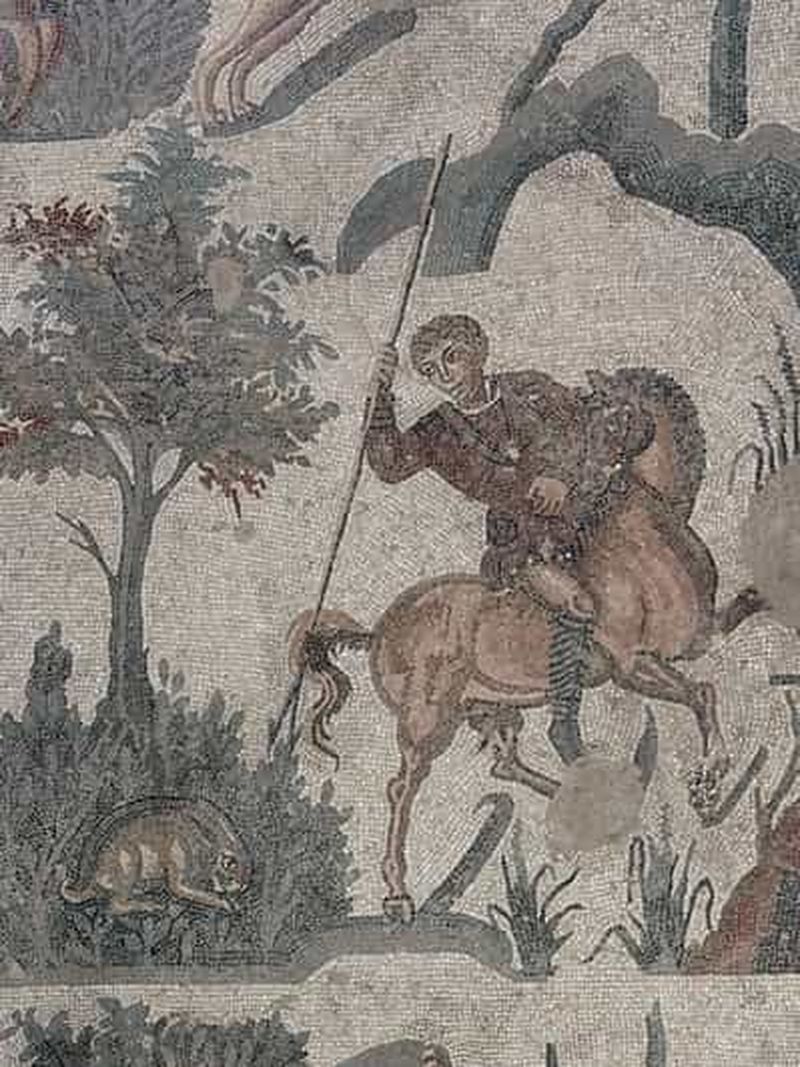 La Grande Salle de la Chasse illustre l’engouement romain pour les scènes cynégétiques, présentant chasseurs, animaux exotiques et décors forestiers. Datée du IVe siècle, elle s’accompagne d’un long corridor recouvert de mosaïques détaillant les différentes étapes de la traque.