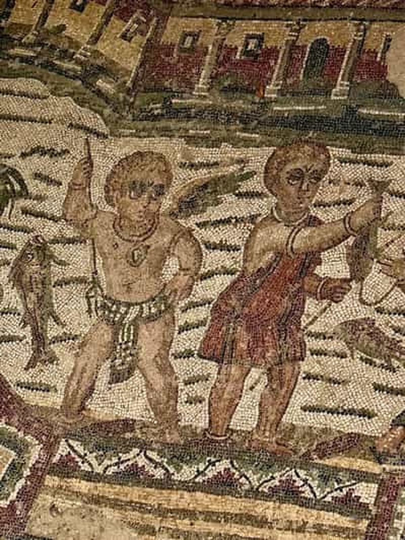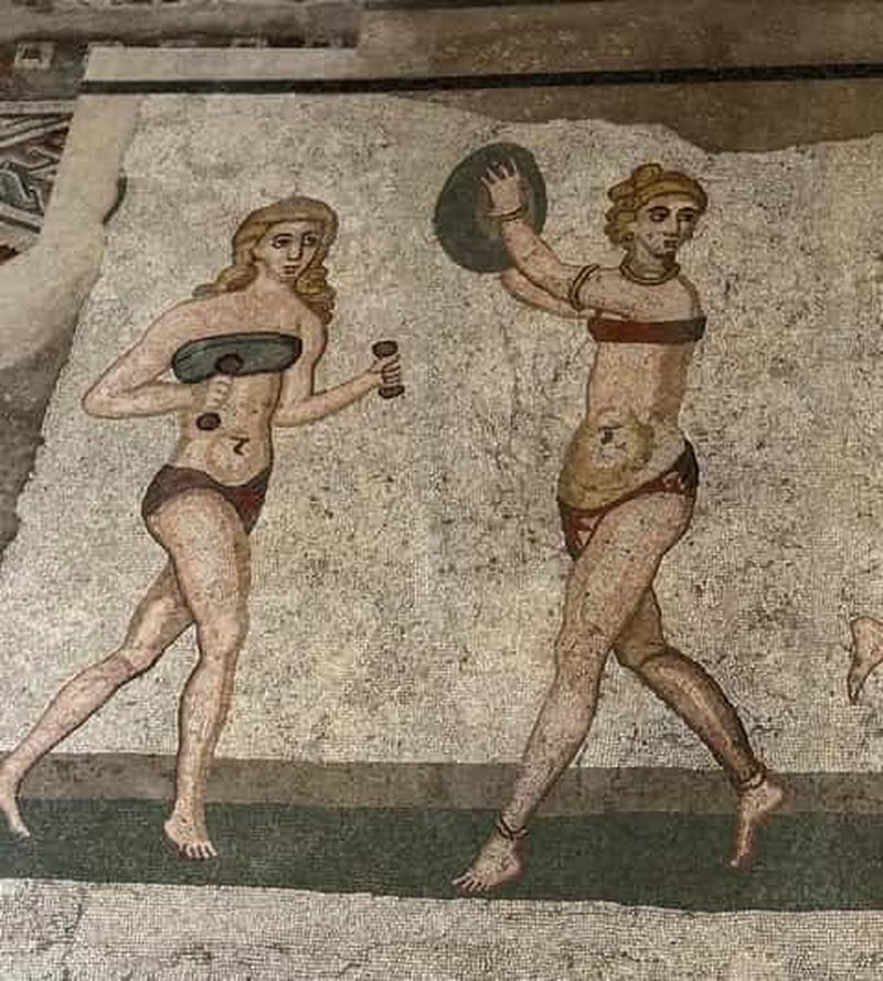 La célèbre Salle des Dix Filles, surnommée « mosaïque des filles en bikini », représente de femmes pratiquant divers exercices sportifs. Ces mosaïques, préservées, datent du IVe siècle et témoignent de l’attention portée à l’éducation physique dans la société romaine. Vous constaterez la précision des gestes, la variété des postures et l’expression réaliste des visages.