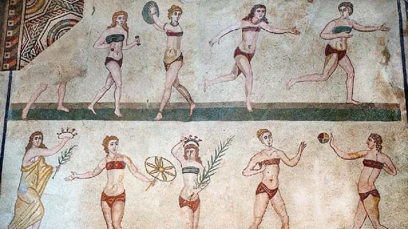 La célèbre Salle des Dix Filles, surnommée « mosaïque des filles en bikini », représente de femmes pratiquant divers exercices sportifs. Ces mosaïques, préservées, datent du IVe siècle et témoignent de l’attention portée à l’éducation physique dans la société romaine. Vous constaterez la précision des gestes, la variété des postures et l’expression réaliste des visages.