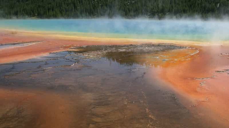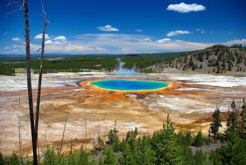 Grand Prismatic Spring, la plus grande source chaude des États-Unis, étonne par ses couleurs vives créées par des microbes thermophiles. Découverte par des géologues en 1871, elle s’étend sur plus de 90 m de diamètre. Les nuances d’orange, de jaune et de bleu profond changent selon la température de l’eau. Son nom évoque un prisme lumineux, reflétant la beauté de Yellowstone. Une passerelle aménagée facilite l’observation de cette merveille naturelle.