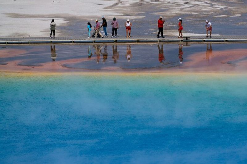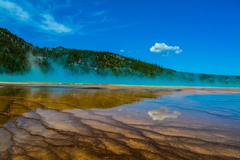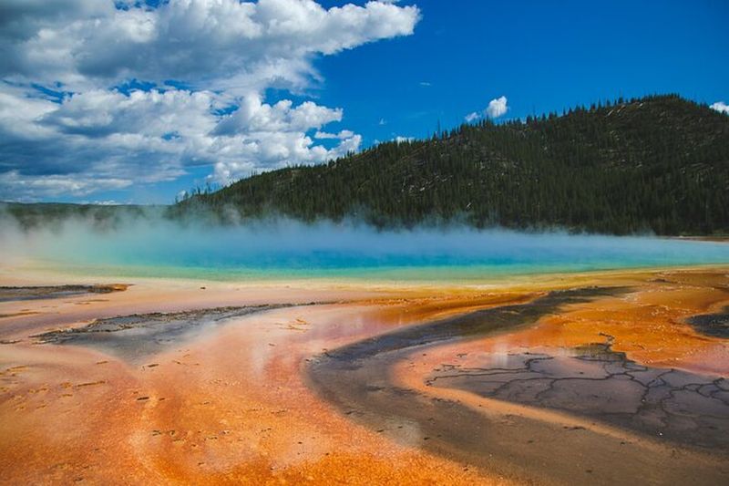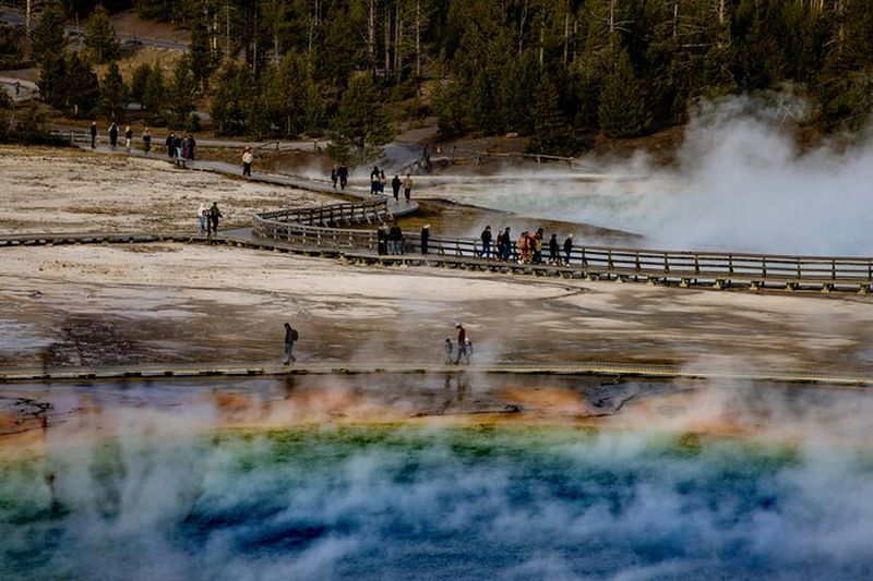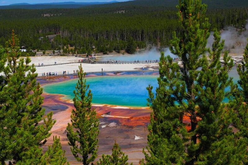 Grand Prismatic Spring, la plus grande source chaude des États-Unis, étonne par ses couleurs vives créées par des microbes thermophiles. Découverte par des géologues en 1871, elle s’étend sur plus de 90 m de diamètre. Les nuances d’orange, de jaune et de bleu profond changent selon la température de l’eau. Son nom évoque un prisme lumineux, reflétant la beauté de Yellowstone. Une passerelle aménagée facilite l’observation de cette merveille naturelle.